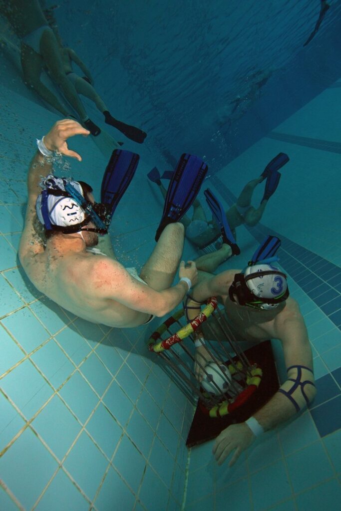 Inventé en 1961 en Allemagne, le rugby subaquatique est vite devenu populaire en Finlande, Norvège, Danemark, Suède, Italie et en Colombie. Pratiqué sous la surface de l’eau dans une profondeur de 3,5m à 5m, le jeu consiste à mettre la balle dans le but, placée au fond de la piscine. Un match se joue sur 2 périodes de 15 minutes avec une pause de 5 minutes.